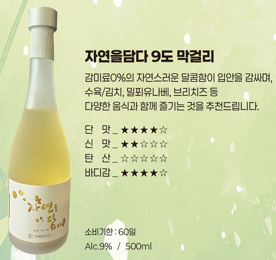| 주요제품명 | 장유막걸리, 자연을담다 9, 자연을담다 12 |