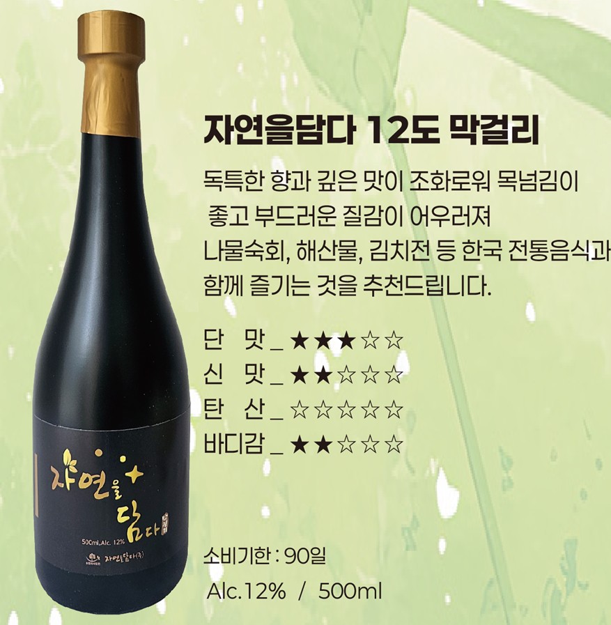 | 회사소개 | 농업회사법인 자연을담다㈜는 장유도가의 오랜 막걸리 제조 전통의 명맥을 이어가고, 전통 방법과 현대적인 제조공정을 결합시켜 새로운 고품질 프리미엄브랜드 막걸리의 제조 판매를 위해 2년 전 설립한 기업으로, 장유 지역의 막걸리 제조 기술을 보유한 송문헌 대가에게서 고품질 막걸리 제조 기술을 이어 받아 지역 전 통지식 및 기술을 복원하고, 우리나라 특산 유산균을 접목하는 등 김해지역 로컬브랜드로 새롭게 발전해 나가는 기업입니다. 농업회사법인 자연을담다㈜의 막걸리 제조기술의 특징으로는 김해지역의 고품질 쌀을 이용, 팽화미를 제조 하여 발효시켜 제조하는 것이 특징이며, 밥을 이용해 발효시키는 방법에 비해 발효과정이 짧고, 아스파탐 및 사카린나트륨의 인공감미료를 일체 넣지 않음에도 단맛이 강하게 나는 것이 특징 |
